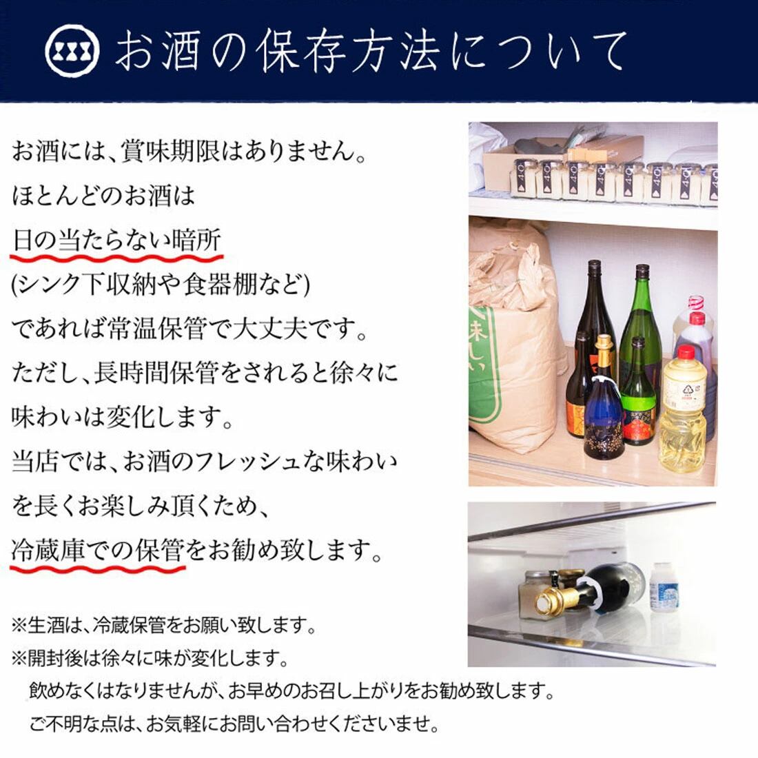 ※生酒は、冷蔵保管をお願いします。 ※開封後は徐々に味が変化します。 飲めなくはなりませんが、お早めのお召し上がりをおすすめします。ご不明な点は、お気軽にお問い合わせくださいませ。